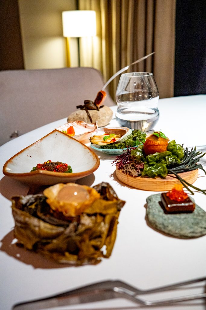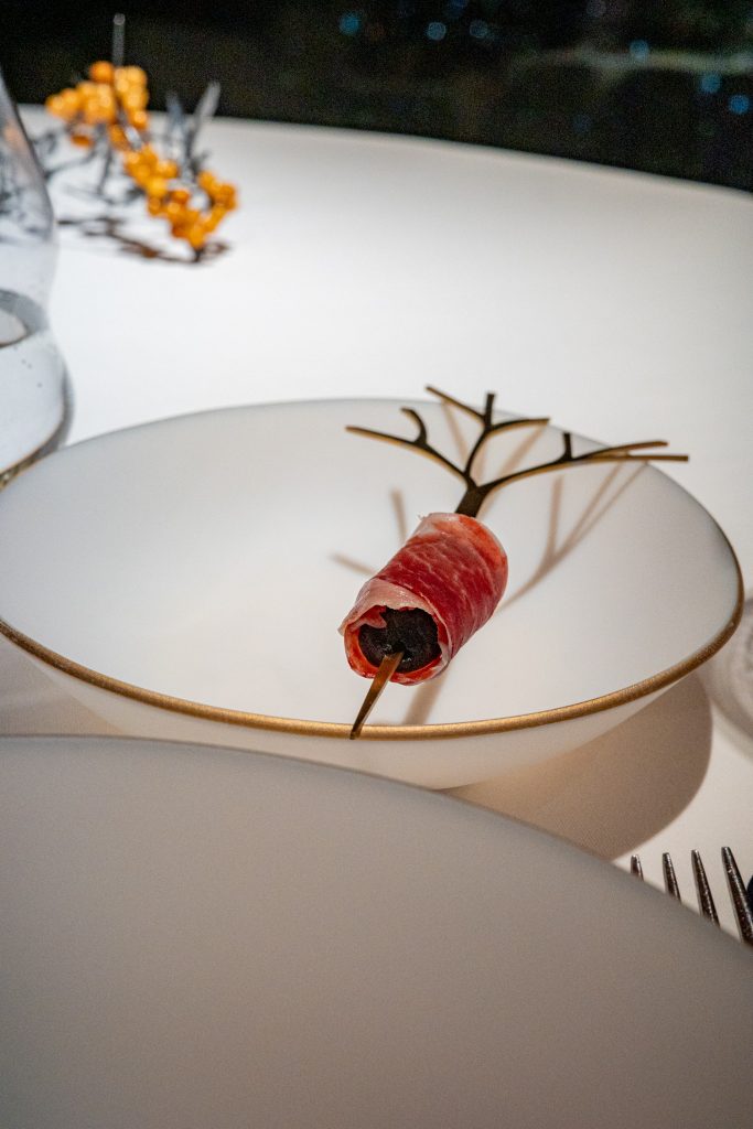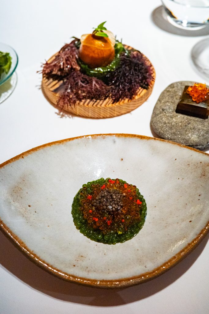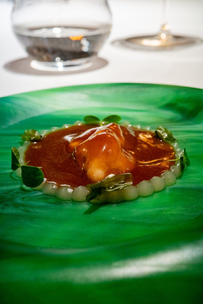 Talerz w kształcie oka, wyłożony został ikrą różnych ryb – jesiotra, troci, ryb latających (tobiko) – oraz kawiorem z alg morskich, które pływały w pomidorowej emulsji. Nabrałem pierwszą łyżkę. Pod zębem zaczęły pękać kulki, jednak tylko kilka z nich miało bardziej intensywny smak. Wstęp do kolacji leżał zdecydowanie po stronie subtelności. Miał obudzić kubki smakowe, a nie zaatakować je od pierwszych sekund. Osobiście, wolę mocne kopnięcie już na starcie, ale Arco zawsze niezwykle doceniałem za dania oddalone od moich osobistych preferencji kulinarnych. Pozwalały mi poszerzać horyzonty. Czasem zmuszały do zadania sobie wielu pytań. I “oko z kawioru”, choć było delikatnym i wcale nie moim ulubionym amuse bouche’em, nadal jest w mojej głowie.
