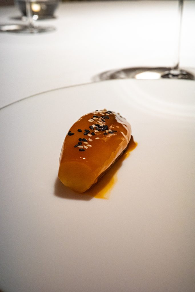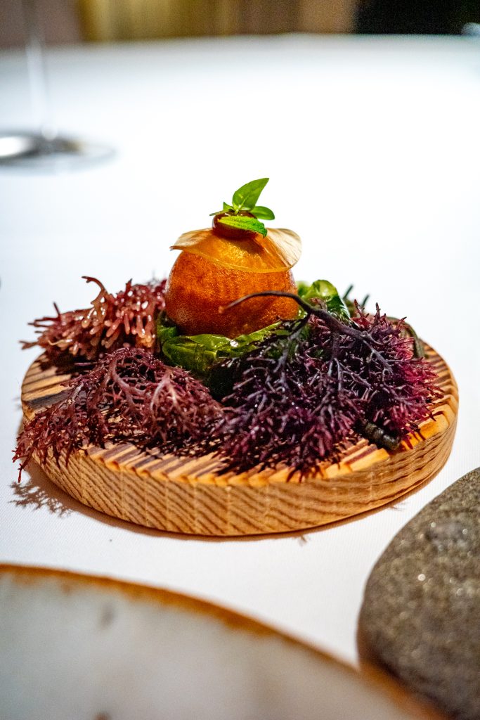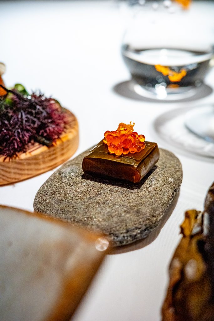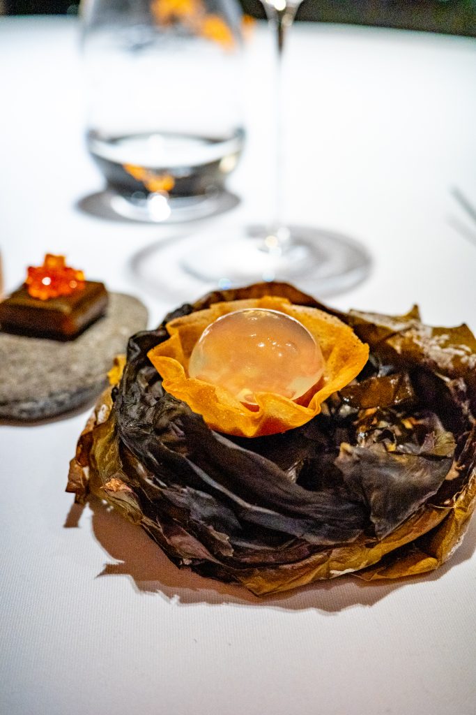 Najbliższy amuse powinien więc zrobić kolejny krok na drabinie intensywności. Tymczasem, gdy spróbowałem troci otocznej glonami kombu i wyglądającej niemal jak czekoladka, poczułem rozczarowanie. Było zbyt łagodnie. Zamiast się wspinać, miałem wrażenie, że spadam ze szczebli. Jednak chwilę potem było mi wręcz głupio, że taka myśl w ogóle pojawiła się w mojej głowie. “Czekoladkę” należało rozgryźć – to tu pojawiło się rozczarowanie – a następnie gryźć, gryźć i gryźć, aby glony oddały swój morski smak – to tu zrobiło mi się głupio. Było morsko i bardzo ciekawie.