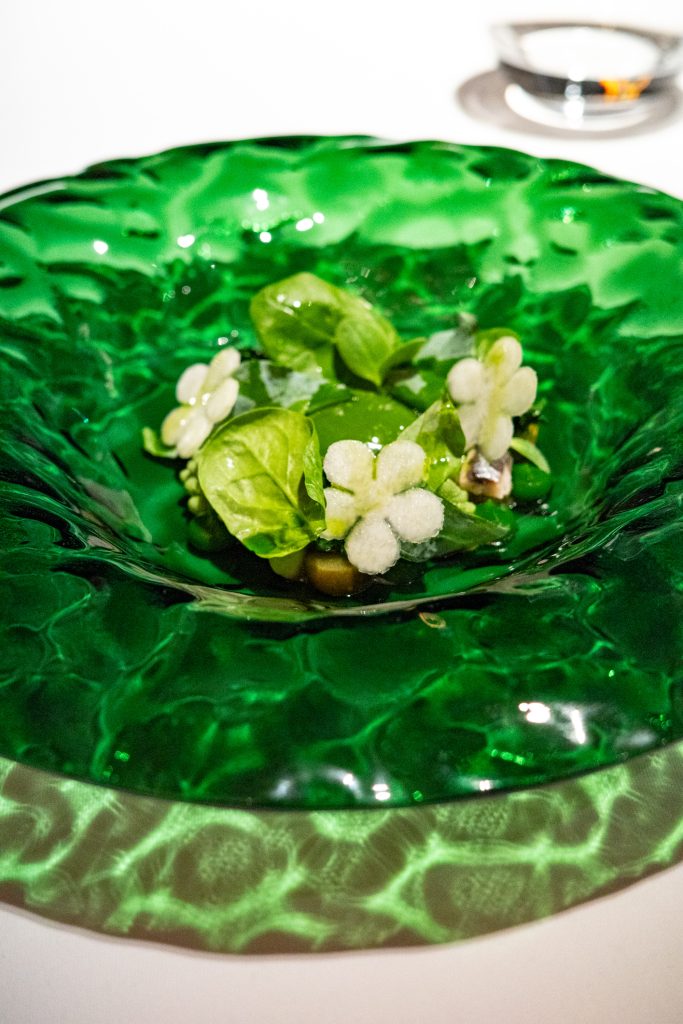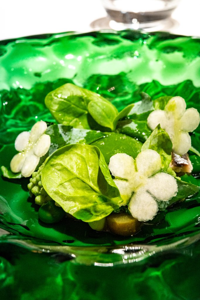 W dodatku, ku mojej wielkiej radości, Szef zadbał o to, bym myślami nie musiał zbyt szybko z tej Hiszpanii wracać. Przede mną pojawił się zielony talerz z zielonymi hiszpańskimi warzywami, hiszpańskimi sardynkami Boquerones i sferą z cukinii. Sferę należało rozerwać, a znajdujący się w niej płyn potraktować jako sos do tej jakże zielonej “sałatki”.