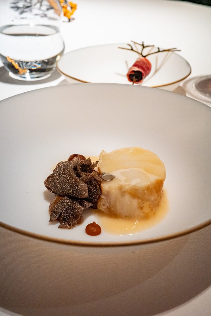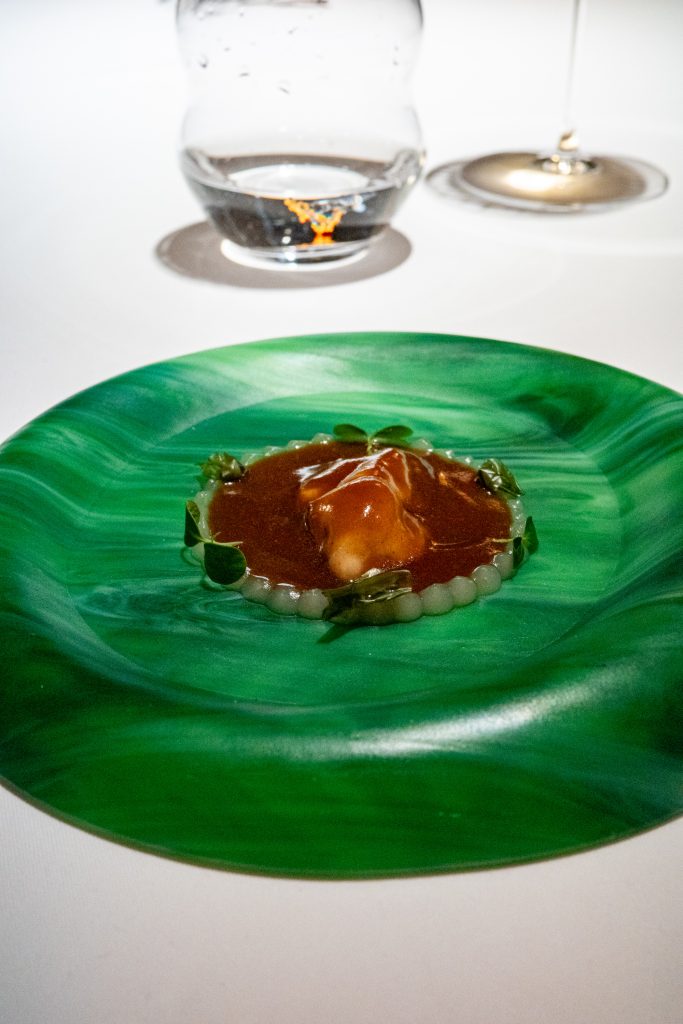 Ostryga Gillardeau skąpana w kolagenowym, gęstym sosie z dzika, a dookoła żel z selera. Sos miał konsystencję niemal jak pil pil, a ostryga i selerowy żel działały tak, jak wędzony węgorz w La Tasquerii. I wiem, że mogę być jednym, którego skojarzenia poleciały tak daleko. Trudno. Danie było WSPANIAŁE. Wywalające z butów. Morsko-mięsno-kolagenowe. Miało wspaniałą równowagę między dzikiem, a ostrygą, a ja miałem wielką ochotę wyściskać Szefa. Utopianie rozkoszą nazywają każdy stan względnie czynność psychiczną lub fizyczną, w których doznajemy naturalnego zadowolenia. Mój stan w tę definicję rozkoszy wpisywał się doskonale.