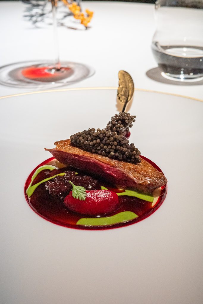 Niestety gołąb z burakami i winegretem, który pojawił się niedługo po żabnicy, też nie przypadł mi do gustu. Ponownie szukałem soli i nie znalazłem jej w odpowiedniej ilości nawet w pokaźnej ilości kawioru, która przykrywała gołębia. Ponownie też, jak przy żabnicy, dodatek, tym razem w postaci wiśni nadziewanej wątróbką gołębia, nie był konieczny, a intensywnością przebijał resztę dania.