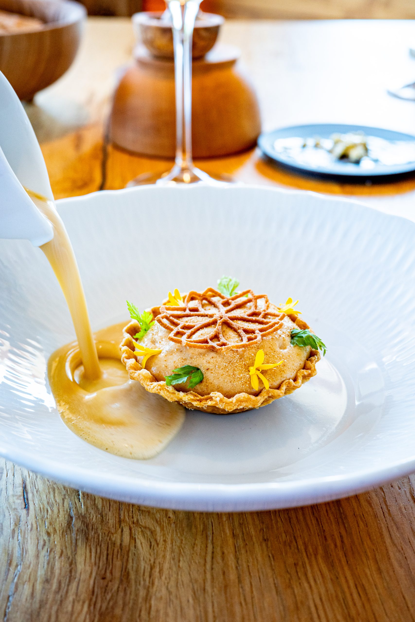 Zarówno w przypadku tatara, jak i foie gras z moskolem, czy kwaśnicy związek z Zakopanem był wyraźnie podkreślany przez osobę prezentującą danie. Czasem czułem się nawet, jak w Asador Etxebarri, gdzie obsługa wskazywała połacie zieleni za oknem i mówiła, że to właśnie tam na spacery chodzi Szef, aby nazbierać grzybów, które znalazły się na talerzu. Pięknie opowiedziana historia pozwalała jeszcze lepiej wczuć się w klimat kolacji i miejsca.