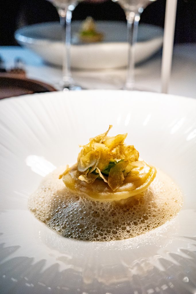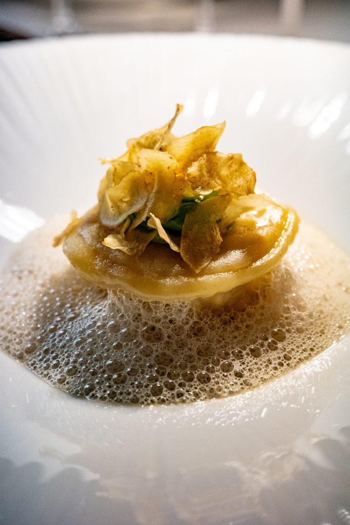I gdy wspomnienia po tatarze jeszcze dudniły w głowie, Szef przygotował kolejną przystawkę. Pierogi z kaszą gryczaną i twarogiem z koziego sera, palonym masłem, miętą i kremem z kasztanów na spodzie. FANTASTYCZNE danie. I mówię to ja, człowiek, nie najlepiej dogadujący się z kozim serem. Gdy nabrałem na łyżkę wszystkie elementy wraz z kremem z kasztanów, powstało połączenie wprost cudowne, potężne w smaku, smakowicie zalepiające usta i stanowiące jeden z ważniejszych argumentów, aby do Rozdziału wrócić jak najszybciej.